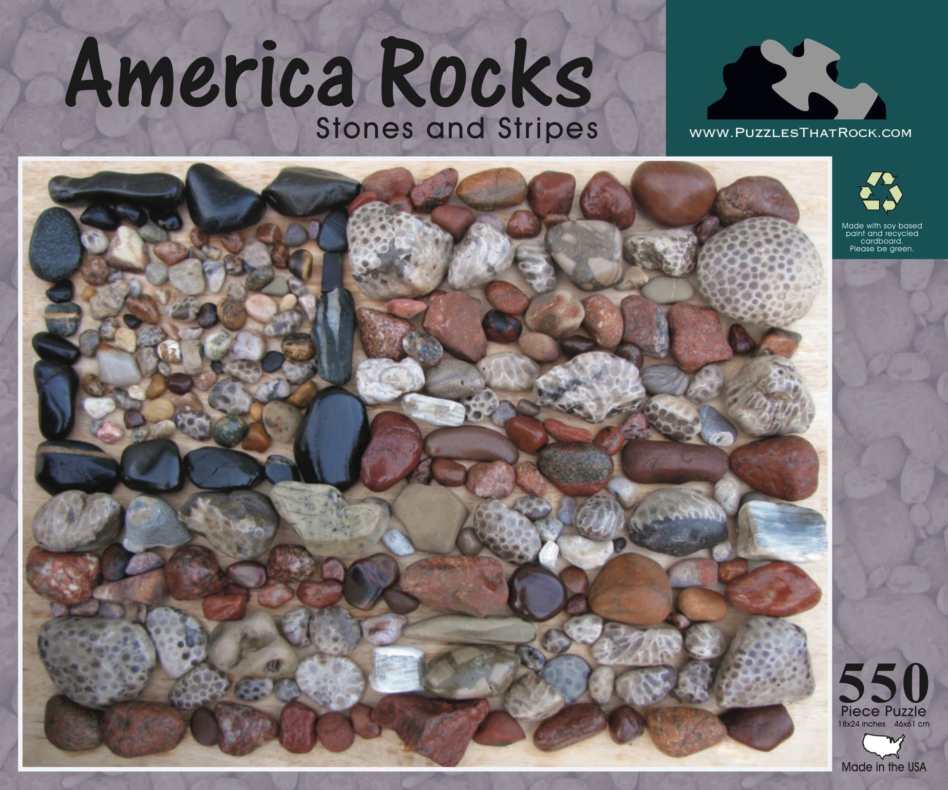 Celebrate natural beauty and patriotic pride with America Rocks: Stones and Stripes. This 550-piece puzzle forms a striking American flag using polished stones and fossils—each stripe and star crafted from nature’s artistry.
