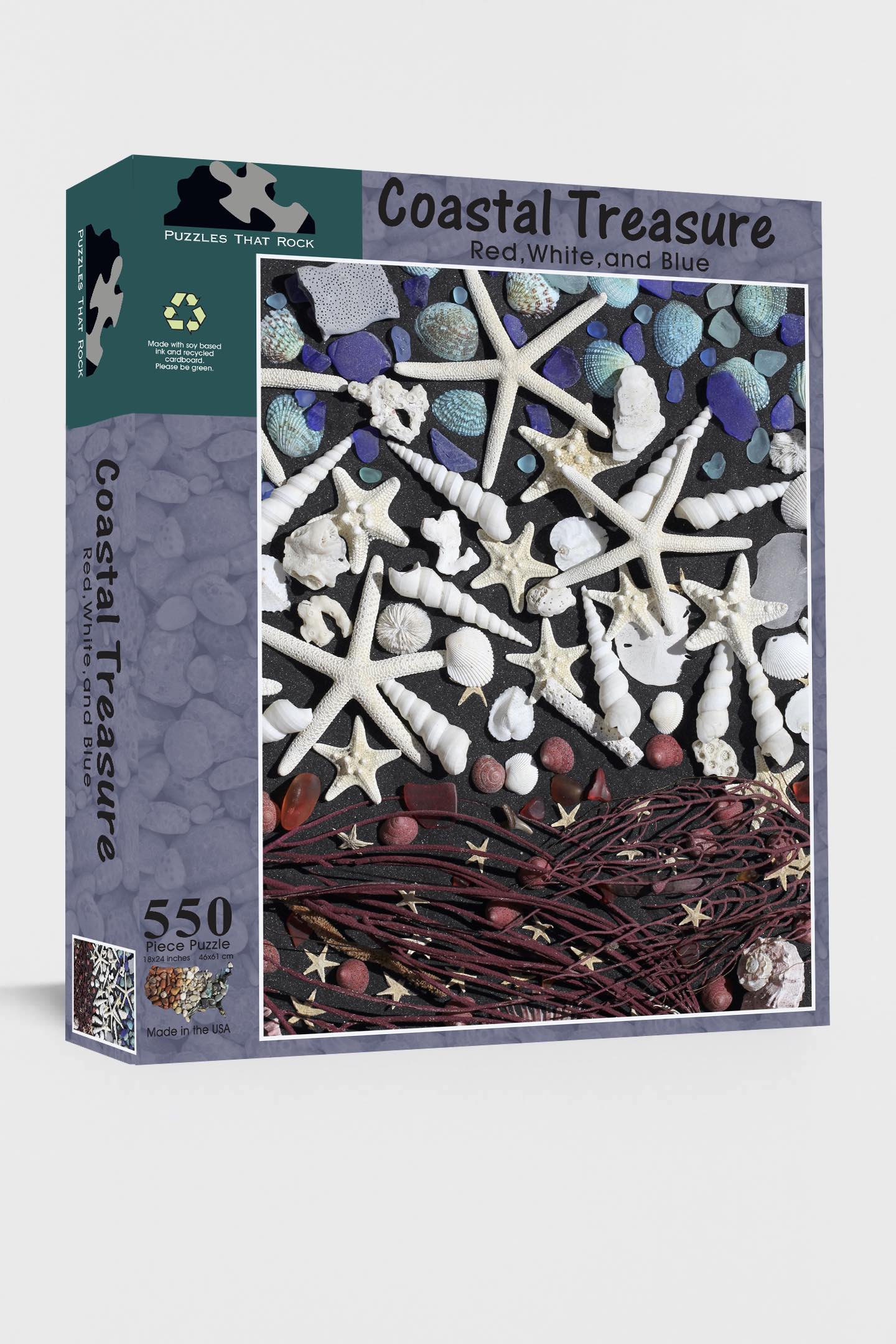 Show your coastal spirit with Coastal Treasure: Red, White, and Blue. With delicate seashells, starfish, and tumbled glass arranged in patriotic hues, this puzzle is a celebration of ocean beauty and American pride.