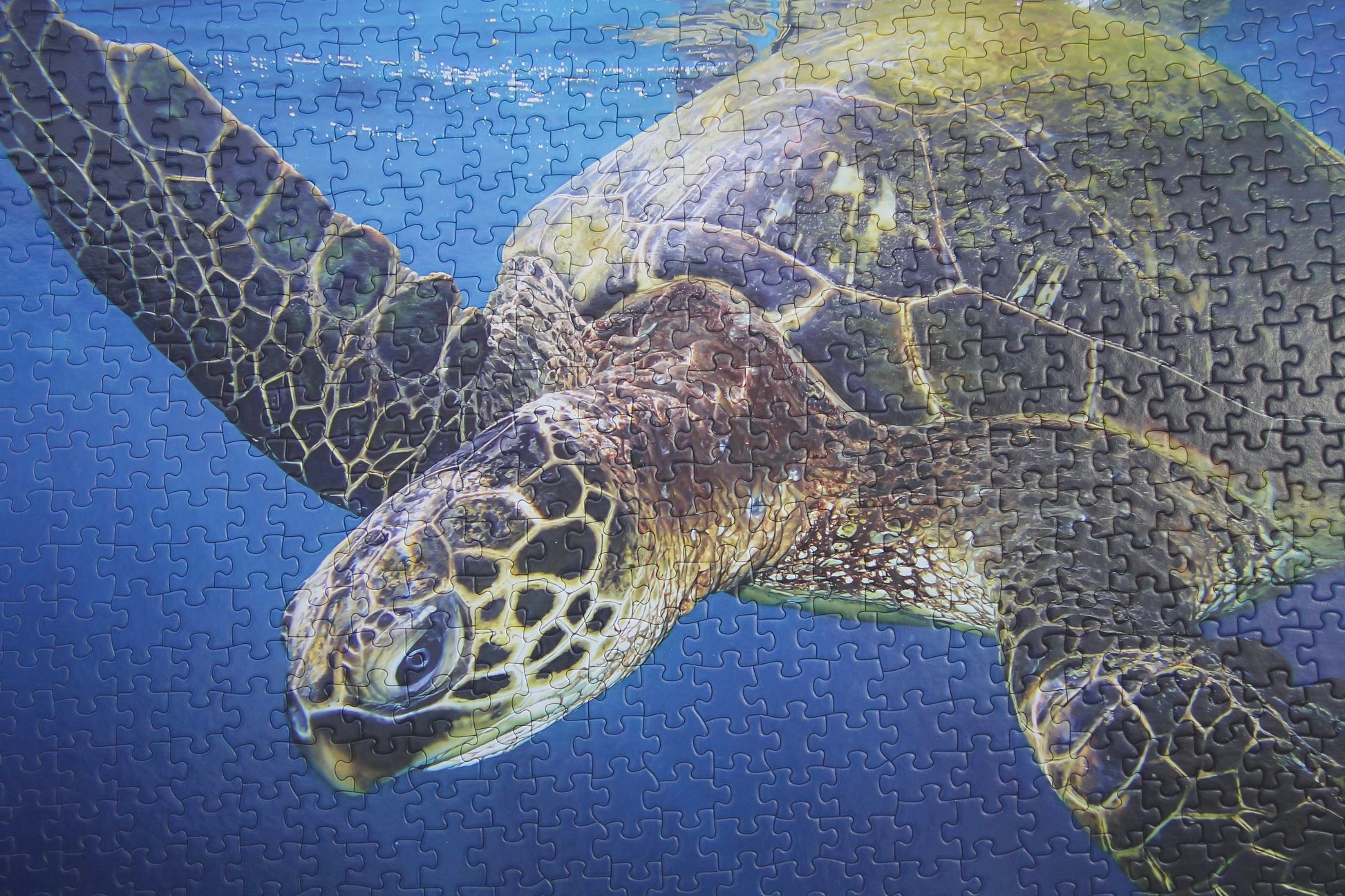 Dive into the deep blue with The Great Turtle, part of the Heather Higham Collection. This sea turtle, photographed mid-glide, brings grace and serenity to your puzzle table in this underwater portrait of marine majesty.
